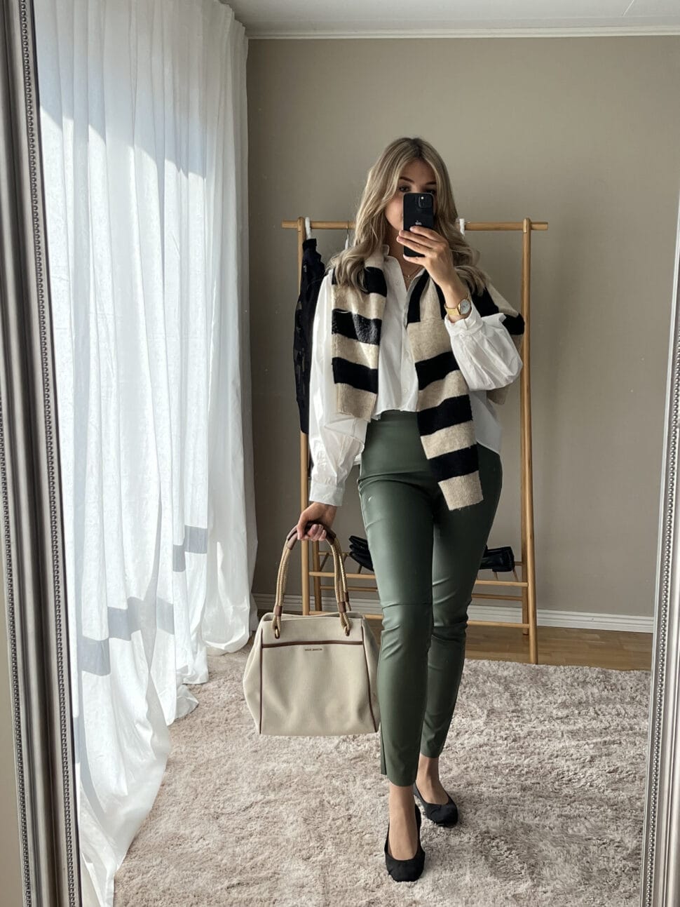 High-shine brown trousers meet a crisp white shirt for a clean, chic contrast this fall. Layered with a textured knit for an effortlessly polished style.