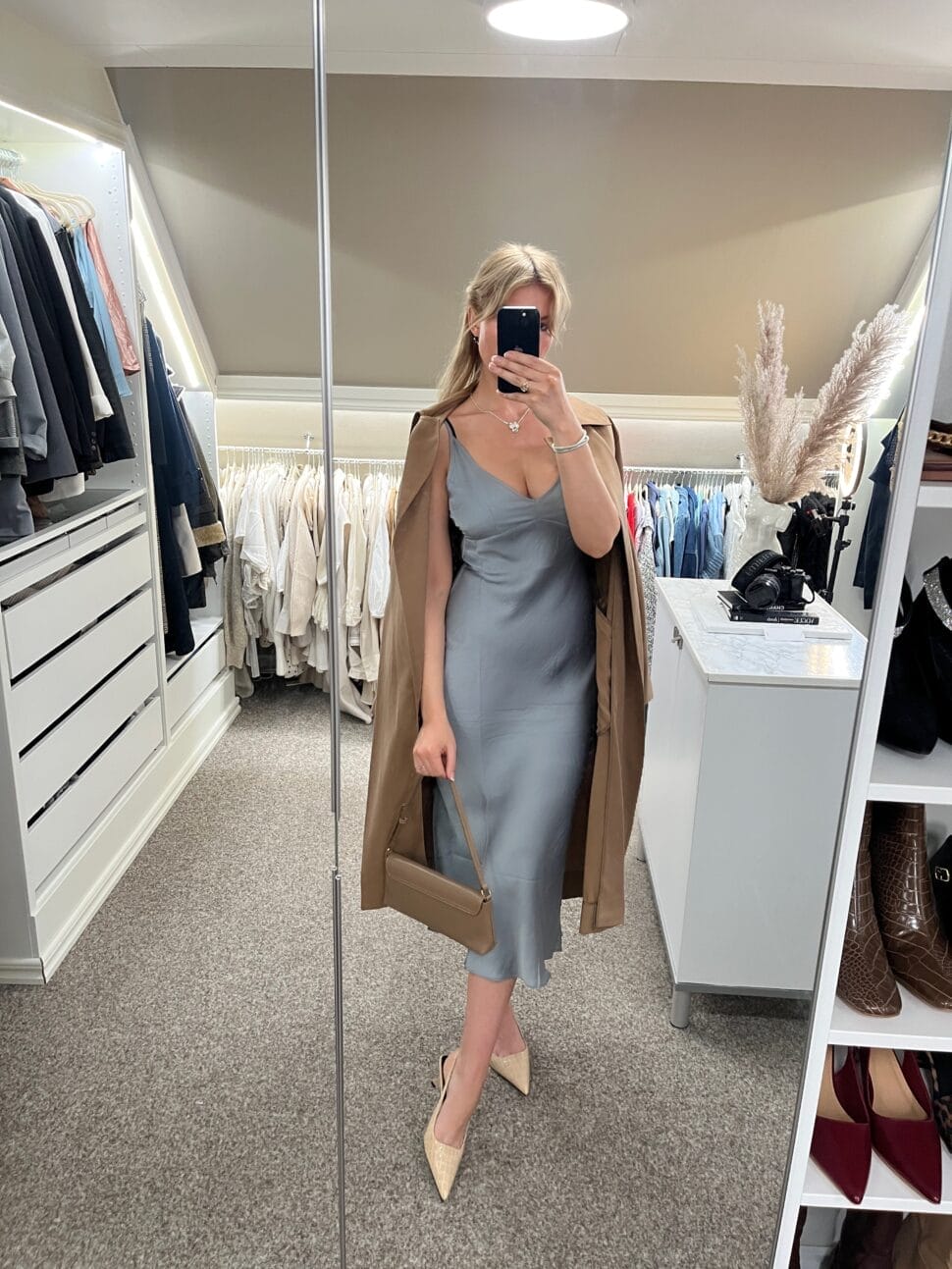 This look pairs the luxurious drape of a grey silk dress with the sharp lines of a trench coat, creating a powerful statement.