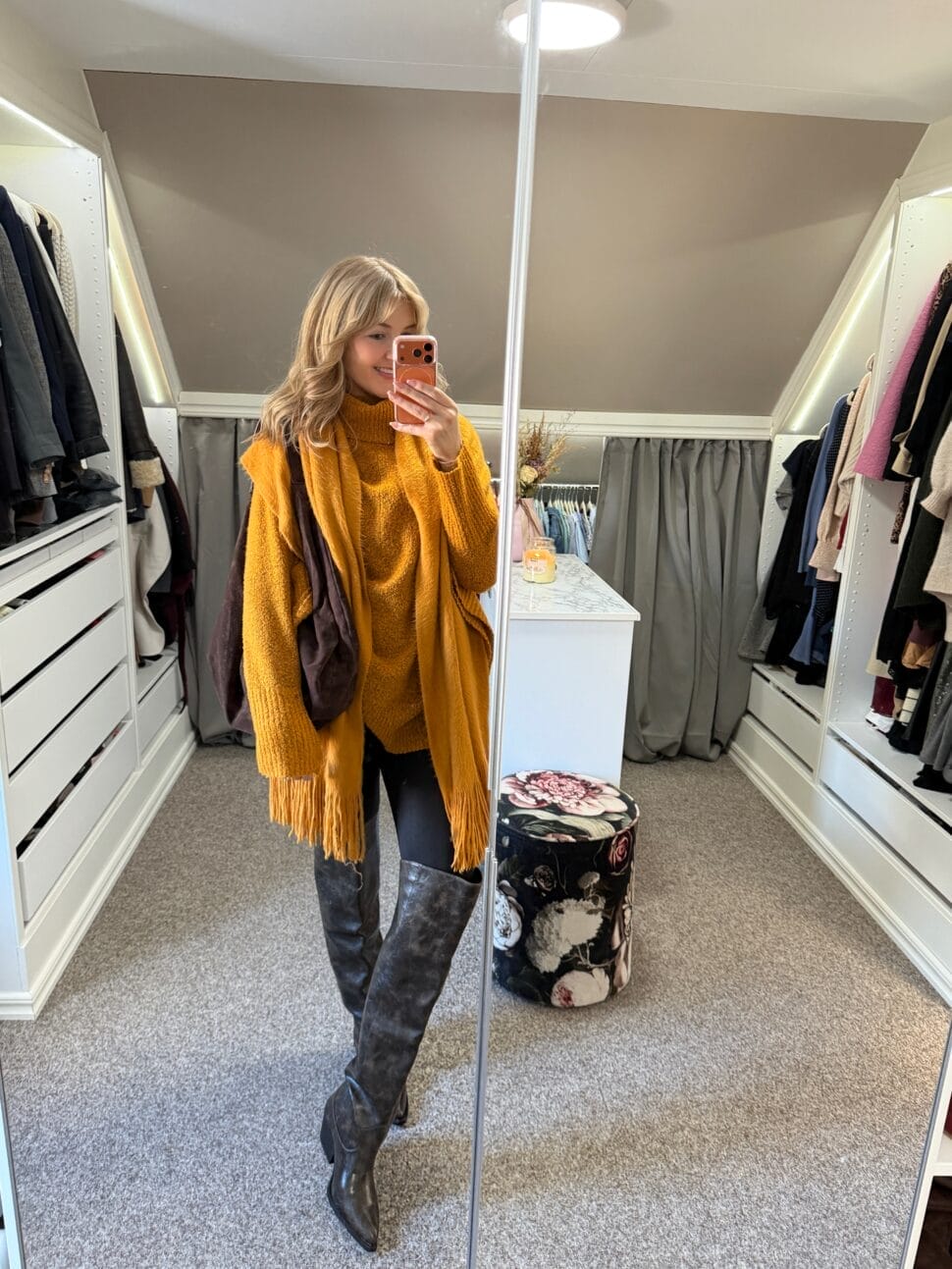 Elevate your style with a vibrant orange poncho and matching oversized scarf. Paired with sleek black leggings, knee-high dark brown boots, and a luxurious suede bag, this look is the perfect blend of warmth and high-fashion elegance.