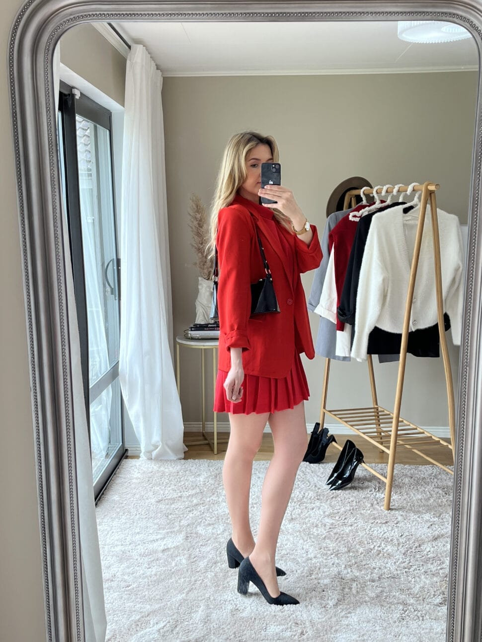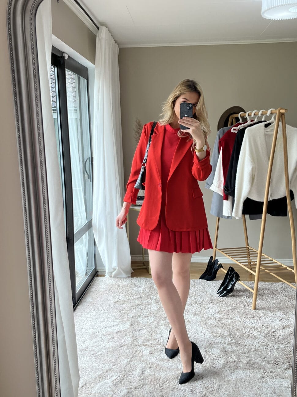 An all-red outfit is perfect for date night. A red dress with ruffles and a red blazer on top, match with a pair of black pointed heels and a small black handbag.