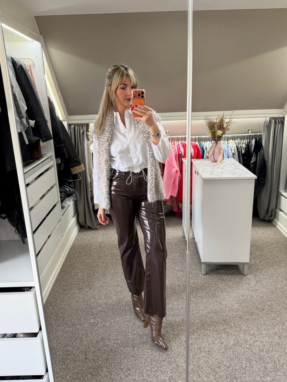 High-shine brown trousers meet a crisp white shirt for a clean, chic contrast this fall. Layered with a textured knit for an effortlessly polished style.